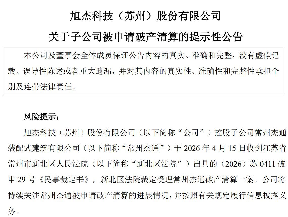 4月16日晚间,旭杰科技(BJ920149,股价10.25元,市值7.84亿元)公告称,控股子公司常州杰通装配式建筑有限公司(以下简称“常州杰通”)被常州市豪创商贸有限公司(以下简称“申请人”)申请破产清算。此事源于金额十多万元的到期债务纠纷。
