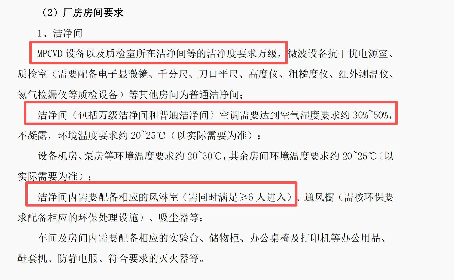 根据河南芯创在2025年7月17日发布的“许昌市超硬材料产业链提质升级(二期)-MPCVD设备车间基础设施改造项目工程总承包(EPC)及监理项目(不见面开标)招标公告”,招标文件明确提出厂房房间要求,比如,“洁净间MPCVD设备以及质检室所在洁净间等的洁净度要求万级”、洁净间(包括万级洁净间和普通洁净间)空调需要达到空气湿度要求约30%~50%,不凝露,环境温度要求约 20~25℃(以实际需要为准);洁净间内需要配备相应的风淋室(需同时满足≥6人进入)等。