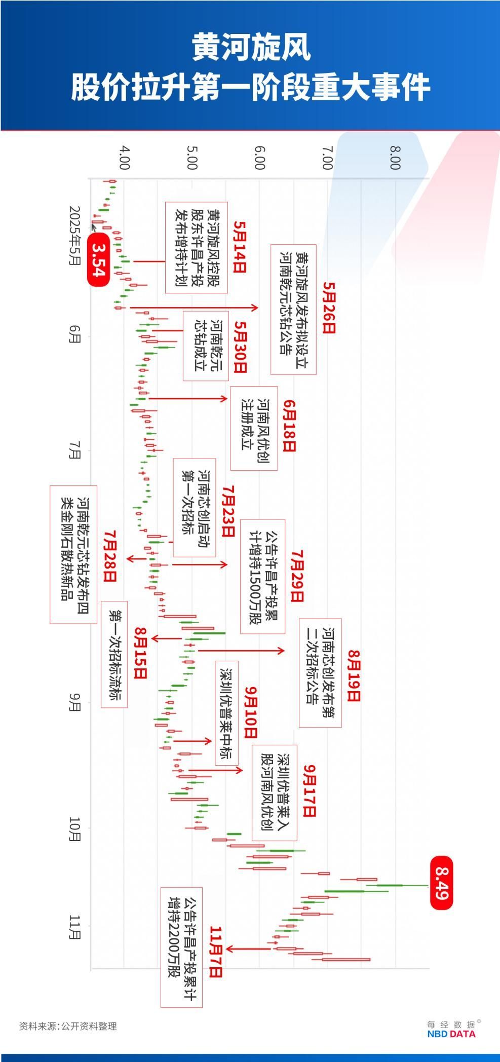 黄河旋风的股价从2025年5月15日收盘价3.86元/股,到2025年10月23日股价来到近三年新高的8.49元/股,在五个月的时间内股价最高涨幅近120%。