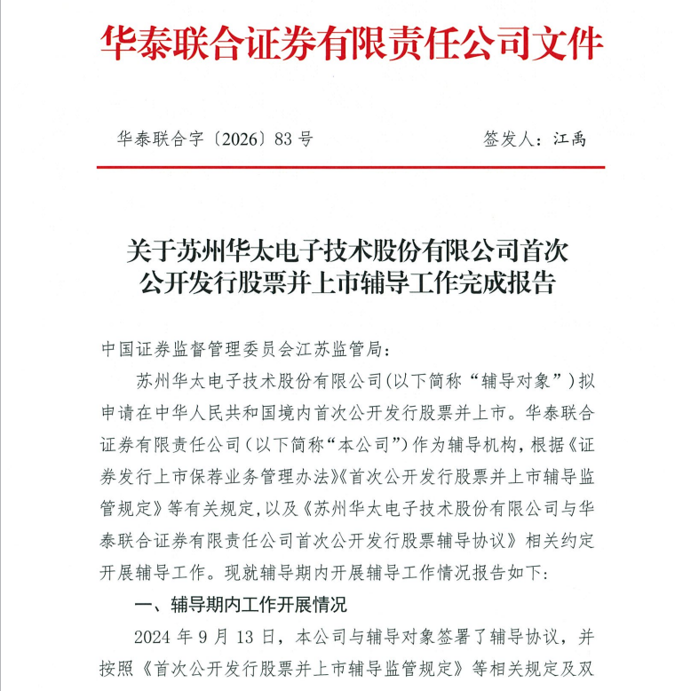 每经AI快讯,据证监会官网IPO辅导公示系统,近日配资炒股,华泰联合印发苏州华太电子技术股份有限公司(简称“华太电子”)上市辅导工作完成报告,该公司拟上市板块为上交所科创板。